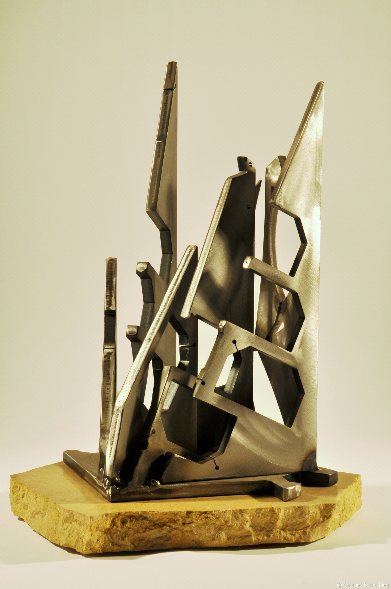 "Montana", Stahl, zaponiert, auf Kalksteinsockel, 42x27x25 cm