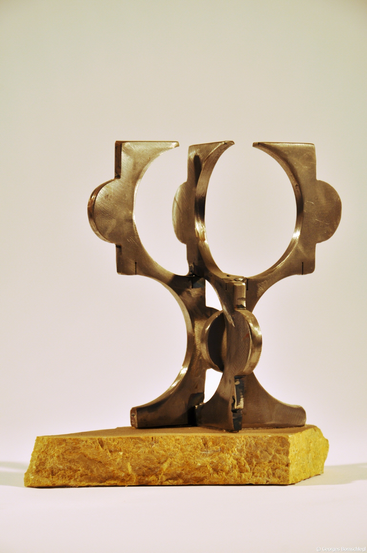 "Begegnung", Stahl, zaponiert, auf Kalksteinsockel, 21x21x10 cm